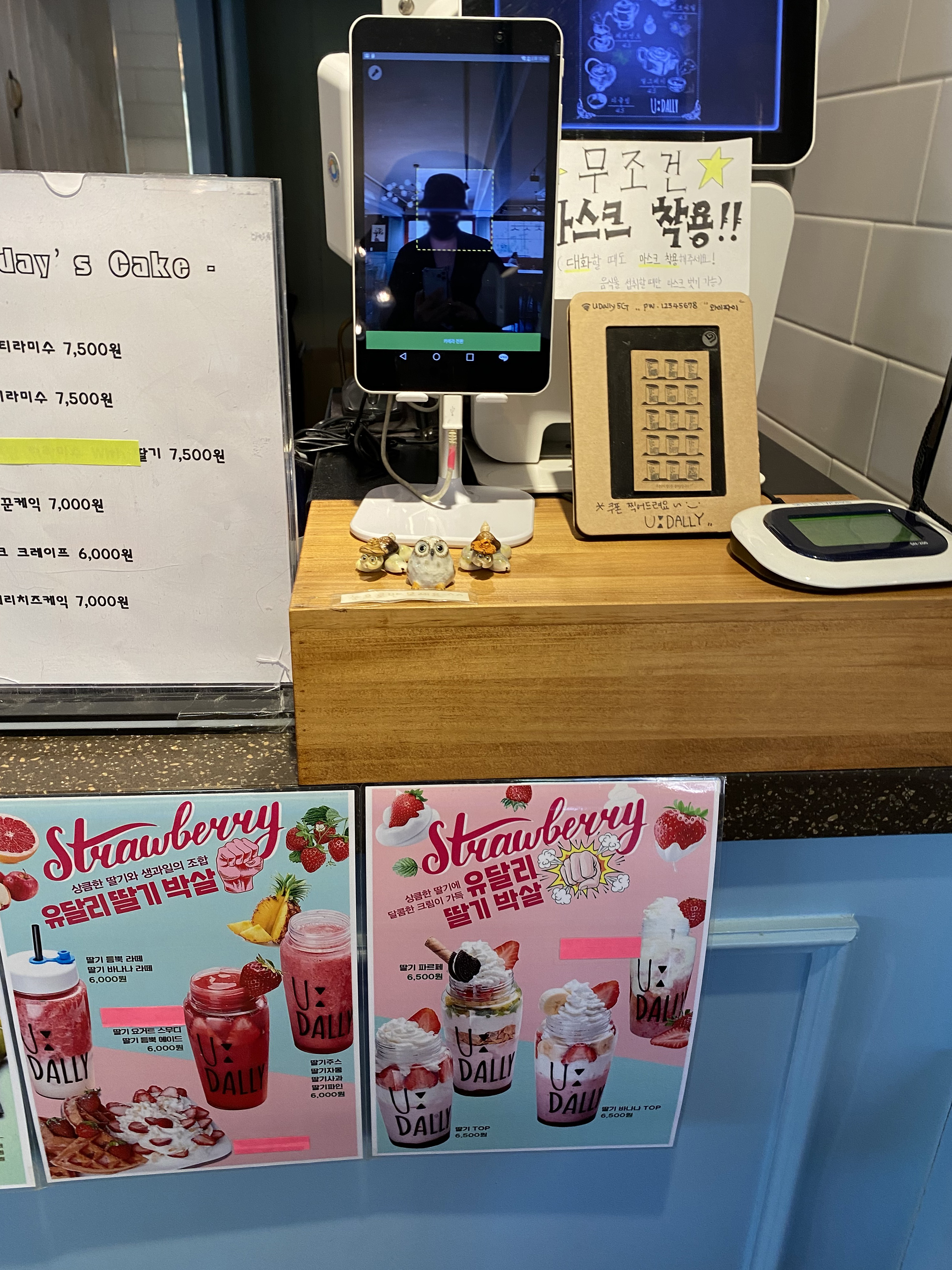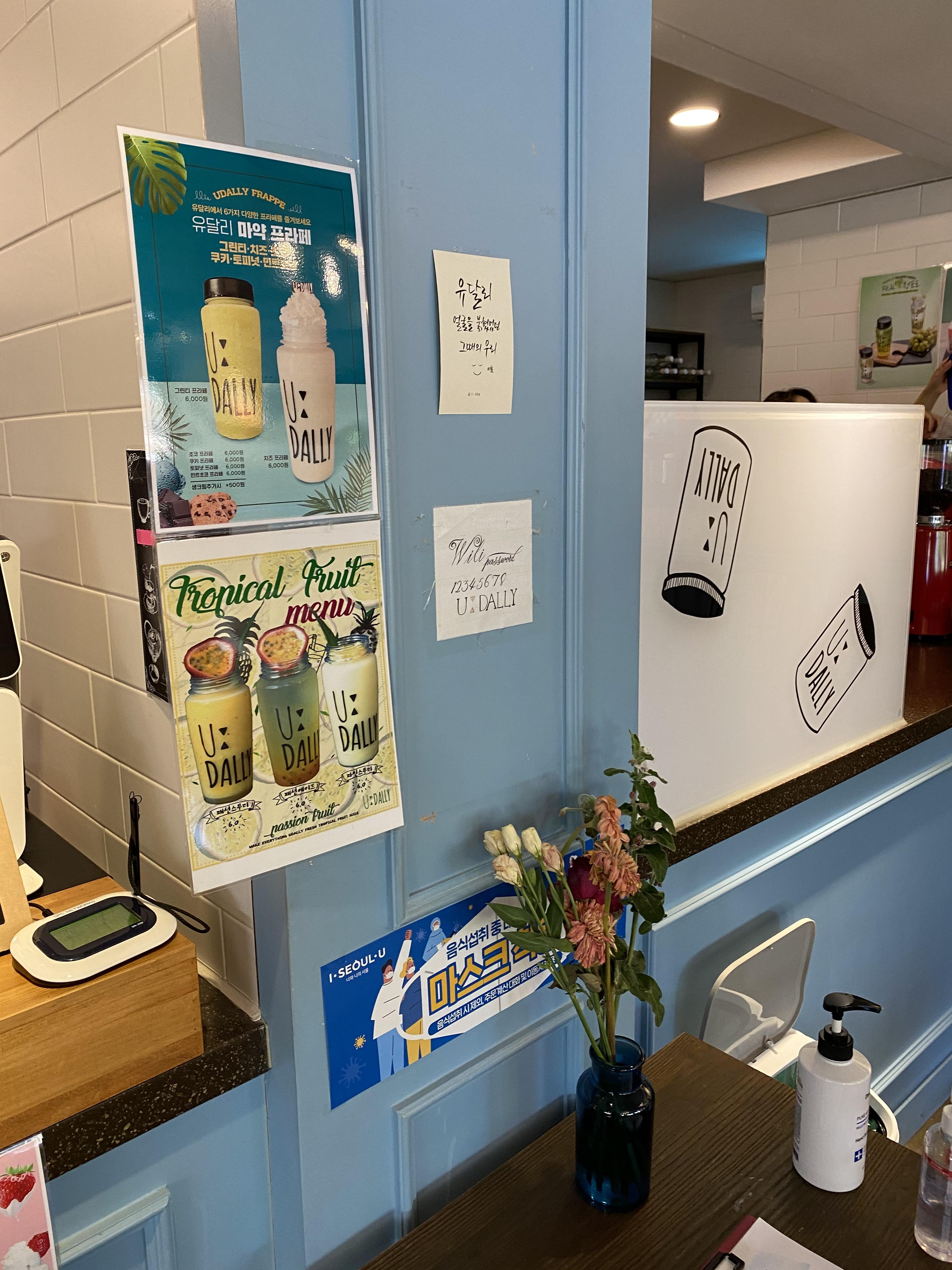 메뉴판 메뉴 외에 음료 포스터들이 계산대에 붙어있습니다.