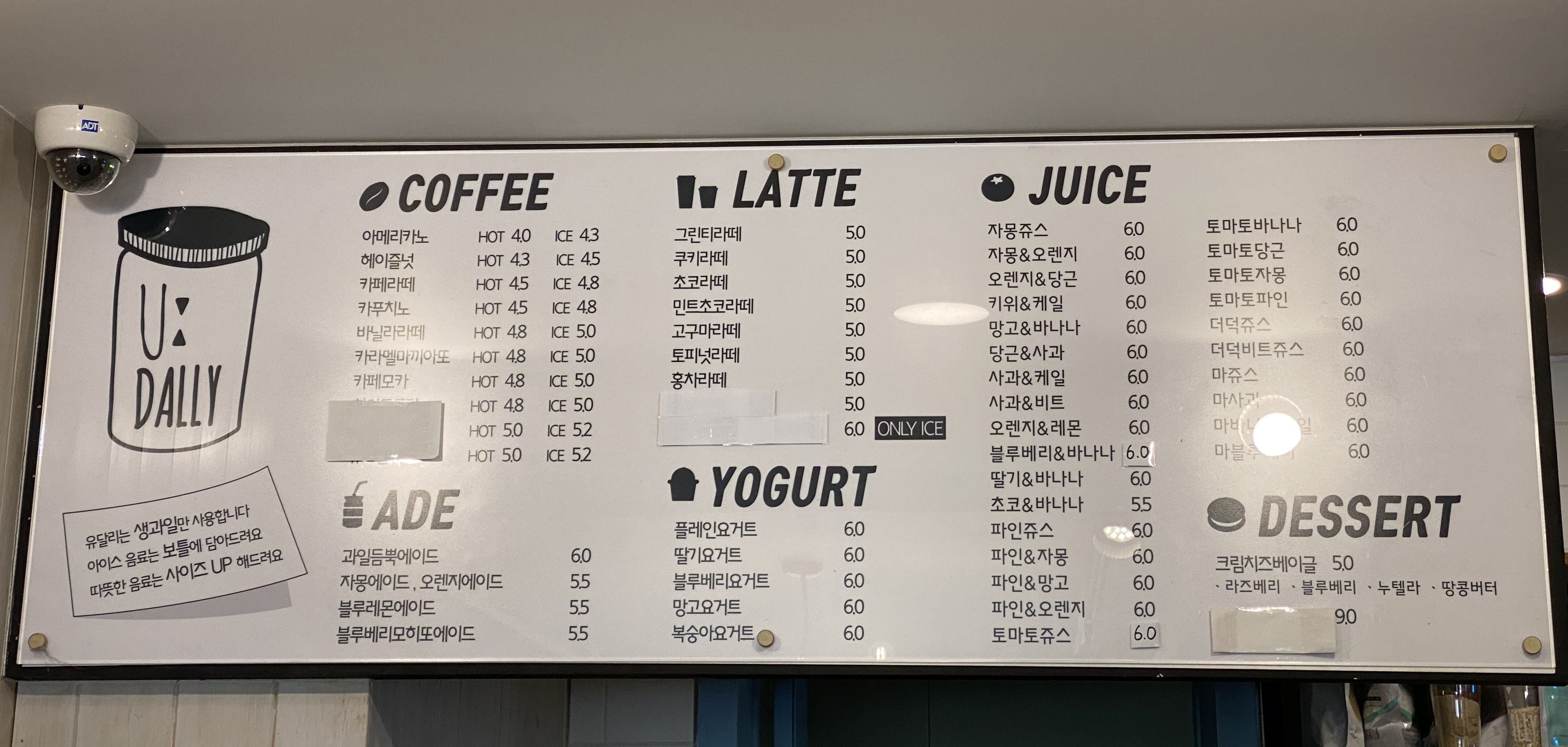 메뉴판입니다. 커피나 에이드, 주스 등 음료 메뉴가 상당히 많습니다.