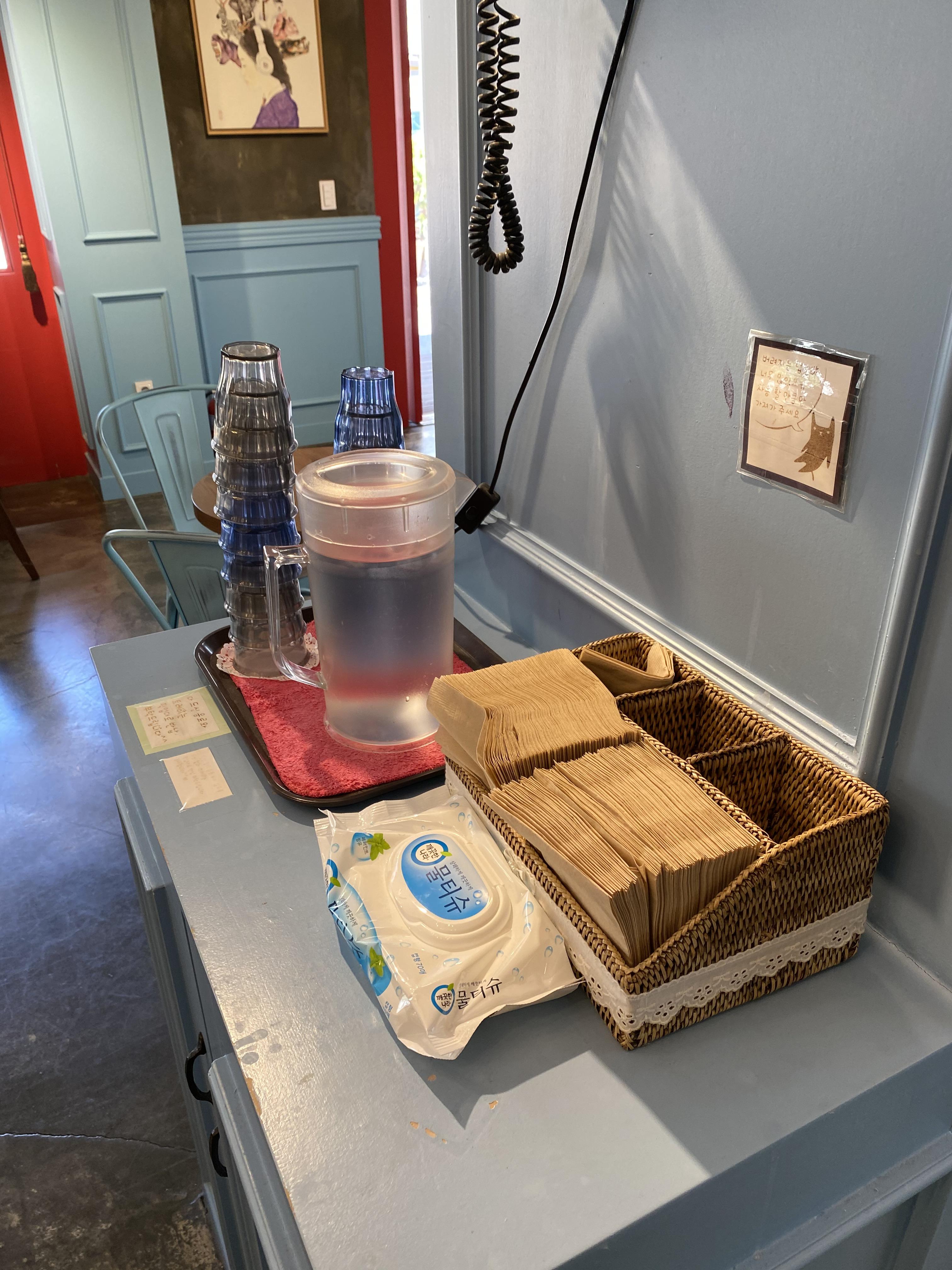 중간 기둥 앞에 있는 물컵과 휴지들~